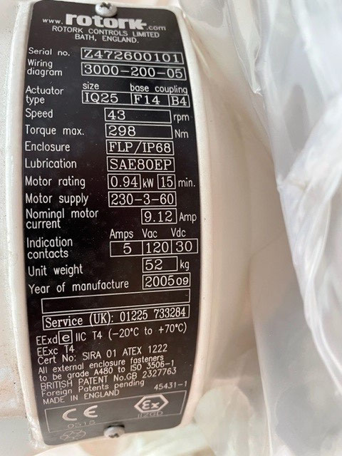 New, unused Rotork IQ25 actuator, complete with bevelgearbox 6:1, with offshore coating system applied. no further documents available.